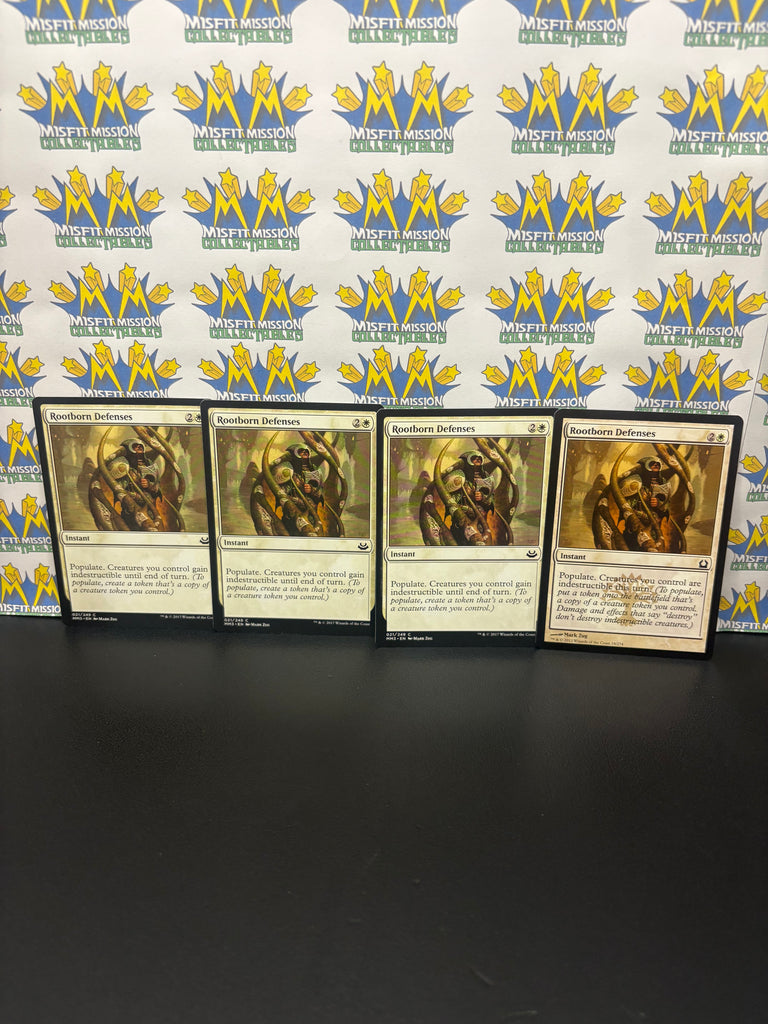 Magic the Gathering: White Instant Rootborn Defenses Card Set of 4, in very good condition.