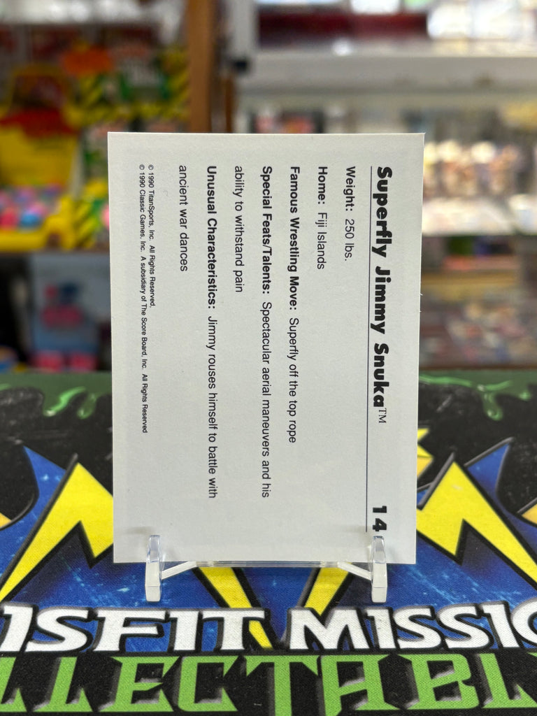 1990 WWF Classic Superfly Jimmy Snuka #14 Trading Card, is a must-have for any wrestling fan. Perfect for adding to your collection or trading with fellow fans.