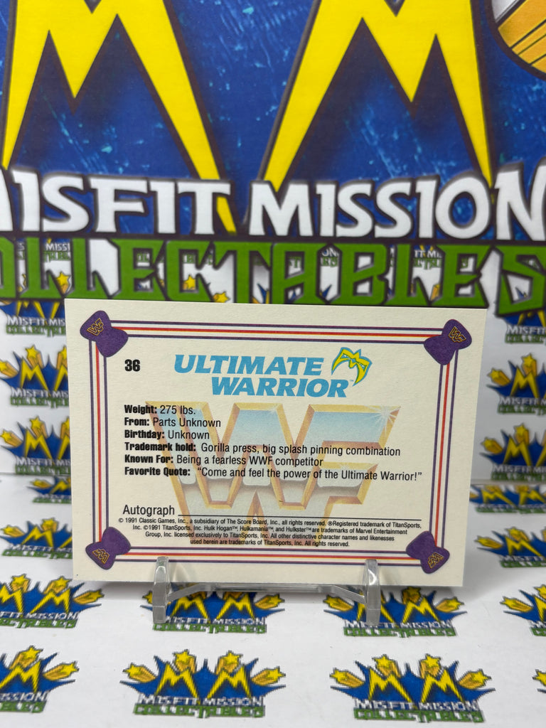 1991 WWF Classic Games Ultimate Warrior #36 Trading Card, previously owned in good condition.