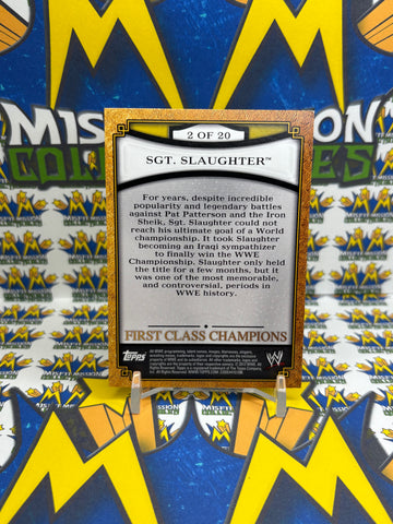 2012 Topps WWE First Class Champions SGT. Slaughter WWE Champion #2 of 20 Trading Card. This card is a must-have for any wrestling fan. You get both the base set and the bronze parallel card. Perfect for adding to your collection or trading with fellow fans.