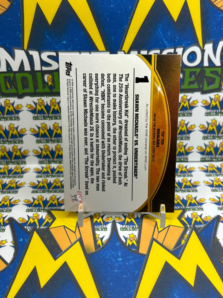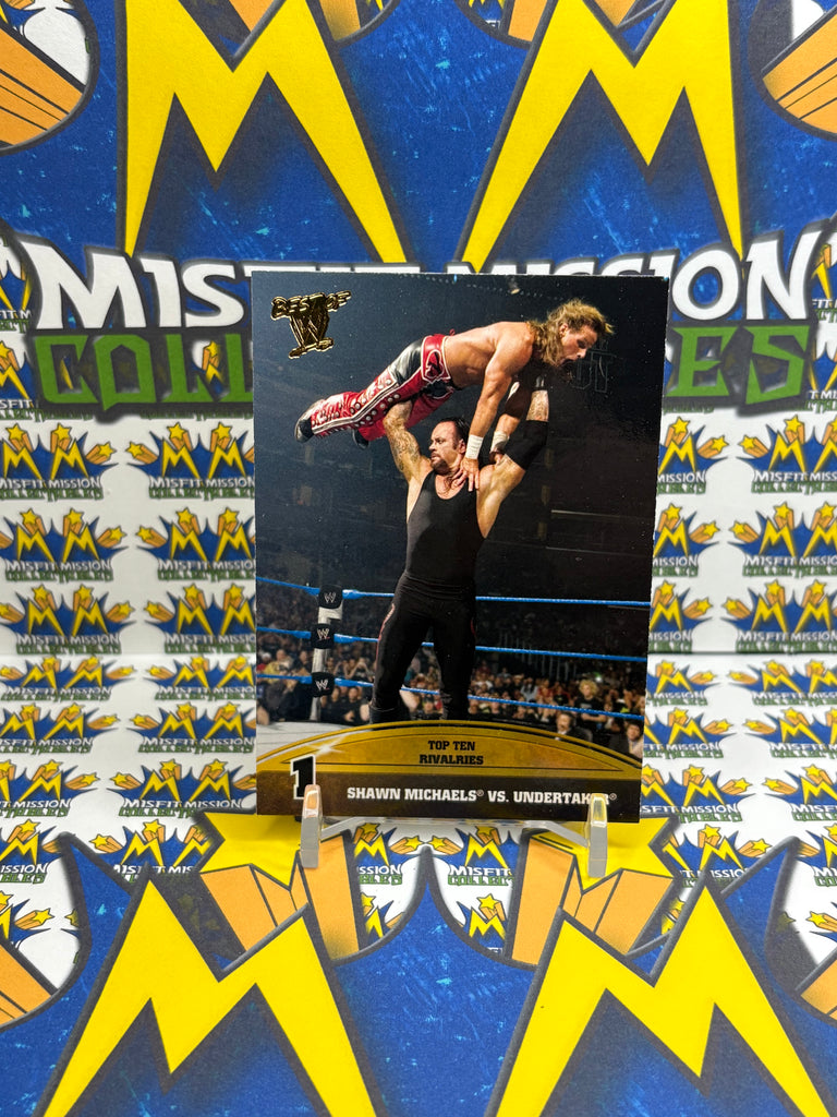 2013 Topps WWE Best of Top Ten Rivals Shawn Michaels Vs Undertaker #1 Trading Card. This RARE card is a must-have for any wrestling fan. Perfect for adding to your collection or trading with fellow fans.