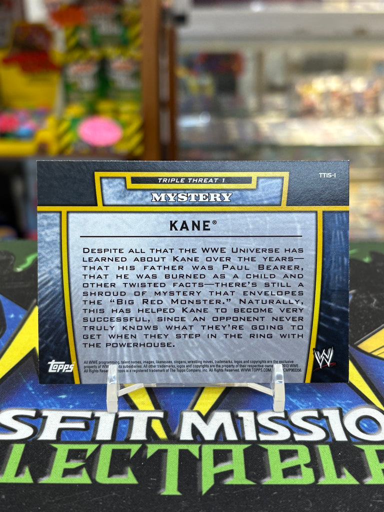 2013 Topps WWE Foil Triple Threat 1 Mystery Kane #TT15-1 Trading Card. This card is a must-have for any wrestling fan. Perfect for adding to your collection or trading with fellow fans.