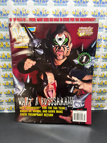 WWE WWF Magazine July 1997 Legion of Doom Cover, previously owned in very good condition. This magazine comes in the original mailing sleeve.