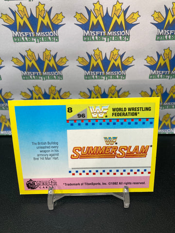 1992 WWE WWF Merlin Gold Series 2 SummerSlam British Bulldog vs Bret Hitman Hart #8 Trading Card. This card was originally issued in the United Kingdom by UK based Merlin Publishing, in like new condition and makes a perfect addition to any collection!