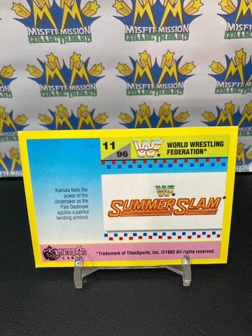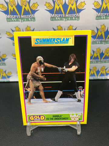 1992 WWE WWF Merlin Gold Series 2 SummerSlam Kamala vs The Undertaker #11 Trading Card. This card was originally issued in the United Kingdom by UK based Merlin Publishing, in like new condition and makes a perfect addition to any collection!