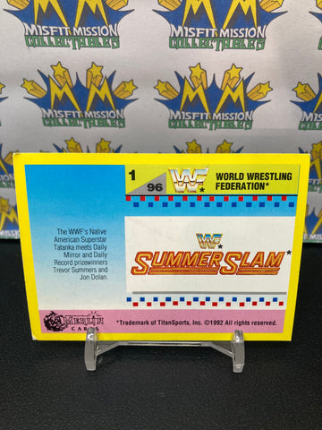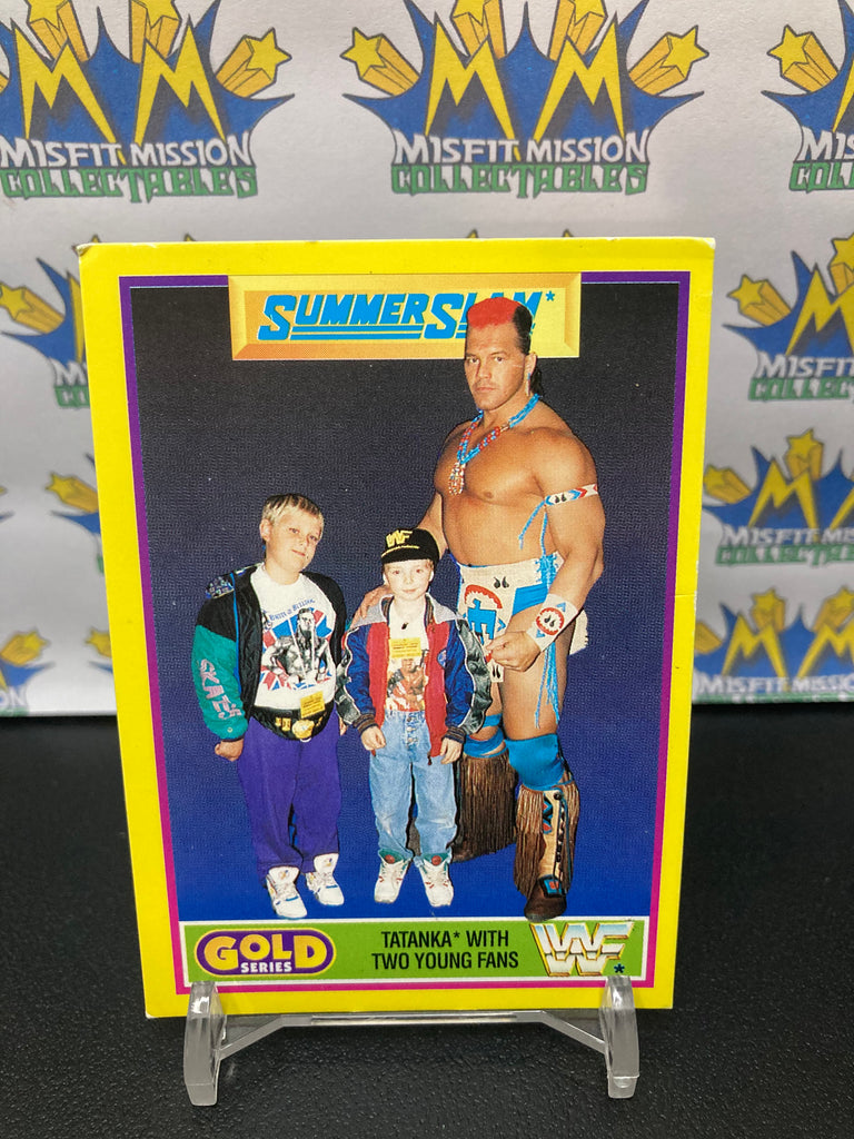 1992 WWE WWF Merlin Gold Series 2 SummerSlam Tatanka with Two Young Fans #1 Trading Card. This card was originally issued in the United Kingdom by UK based Merlin Publishing, in like new condition and makes a perfect addition to any collection!
