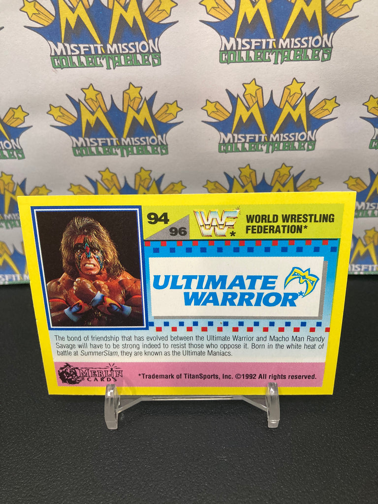 1992 WWE WWF Merlin Gold Series 2 Ultimate Warrior #94 Trading Card. This card was originally issued in the United Kingdom by UK based Merlin Publishing, in like new condition and makes a perfect addition to any collection!