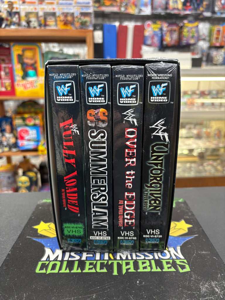 1998 WWF WWE Attitude Video Box Set VHS 4 Tape Set. This set is 75% new and sealed. As you can see in the pictures the original box is opened as well as just Fully Loaded. The other three tapes are still new and sealed.