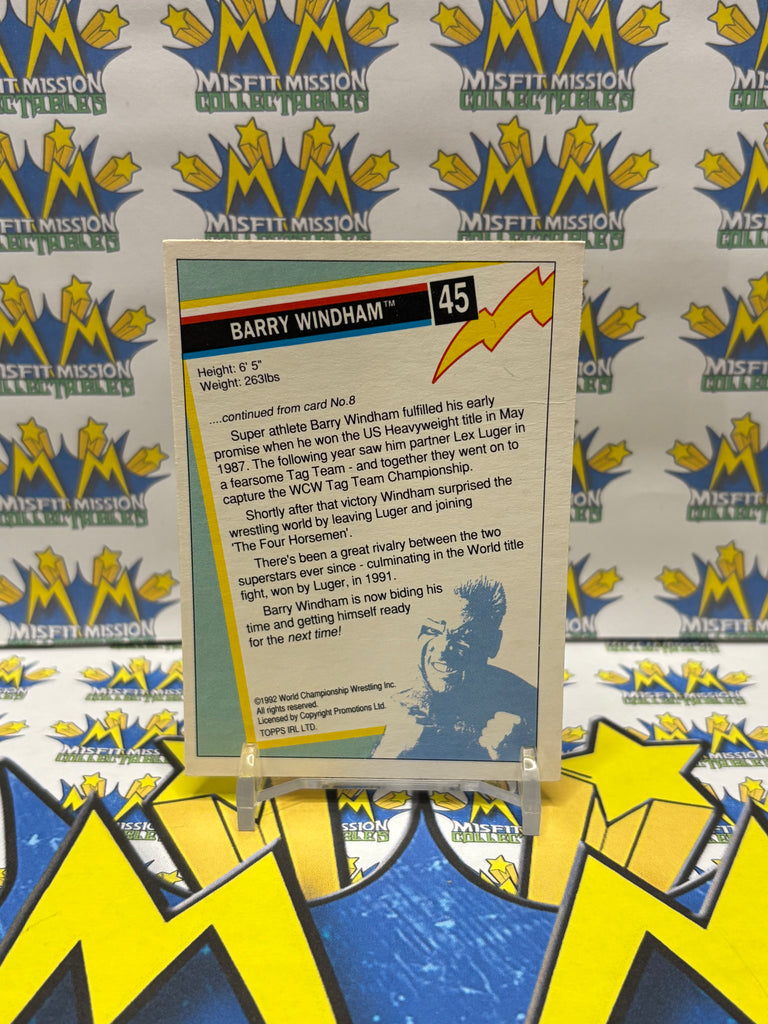 ERROR CARD 1992 TOPPS WCW UK Exclusive Barry Windham Sid Vicious #45 Trading Card. Pictured on the card is Sid Vicious but it is labelled Barry Windham. This card was originally issued in the United Kingdom by Topps Trading Cards. In like new condition and makes a perfect addition to any collection!