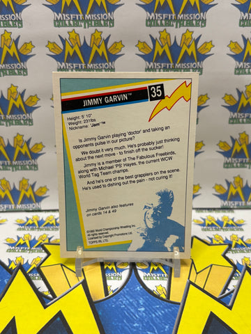 ERROR CARD 1992 TOPPS WCW UK Exclusive Diamond Studd Jimmy Garvin #35 Trading Card. Pictured on this card is Scott Hall aka Diamond Studd and not Jimmy Garvin as it is labelled. This card was originally issued in the United Kingdom by Topps Trading Cards. In like new condition and makes a perfect addition to any collection!