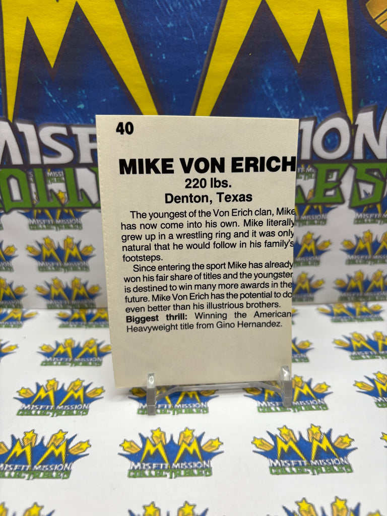 Vintage 1985 Wrestling All-Stars Mike Von Erich #40 Trading Card Hand Cut, previously owned in good condition.